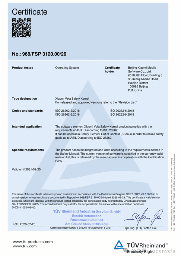 全球汽車(chē)功能安全領(lǐng)域迎來(lái)重要突破——小米自主研發(fā)的Xiaomi Vela Safety內(nèi)核近日通過(guò)德國(guó)萊茵TüV認(rèn)證,獲得ISO 26262 ASIL-D最高等級(jí)功能安全認(rèn)證。這一認(rèn)證標(biāo)志著小米在車(chē)規(guī)級(jí)操作系統(tǒng)內(nèi)核研發(fā)上實(shí)現(xiàn)關(guān)鍵跨越,為智能電動(dòng)汽車(chē)核心安全系統(tǒng)的規(guī)?;瘧?yīng)用奠定技術(shù)基石。