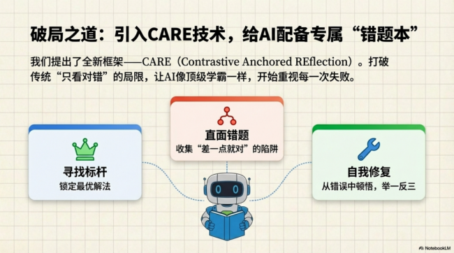 針對這一問題,傳音TEX AI中心與中山大學、MBZUAI團隊合作,開發了CARE(Contrastive Anchored REflection)技術,從訓練機制上對傳統路徑進行了優化。不同于僅以“結果對錯”作為反饋信號的方式,CARE技術將關注點前移到推理過程本身,重點引入“高質量錯誤樣本”——即那些接近正確但存在關鍵步驟偏差的解題路徑。通過將這類樣本與標準解法進行對比分析,并結合反思式重推理機制,模型能夠識別具體錯誤環節,并完成自我修正,從而形成更穩定、連貫的推理能力。在引入反思機制后,模型對復雜問題的二次推理成功率由約10%–19%提升至76.6%,有效增強了面對復雜題目時的穩定性。