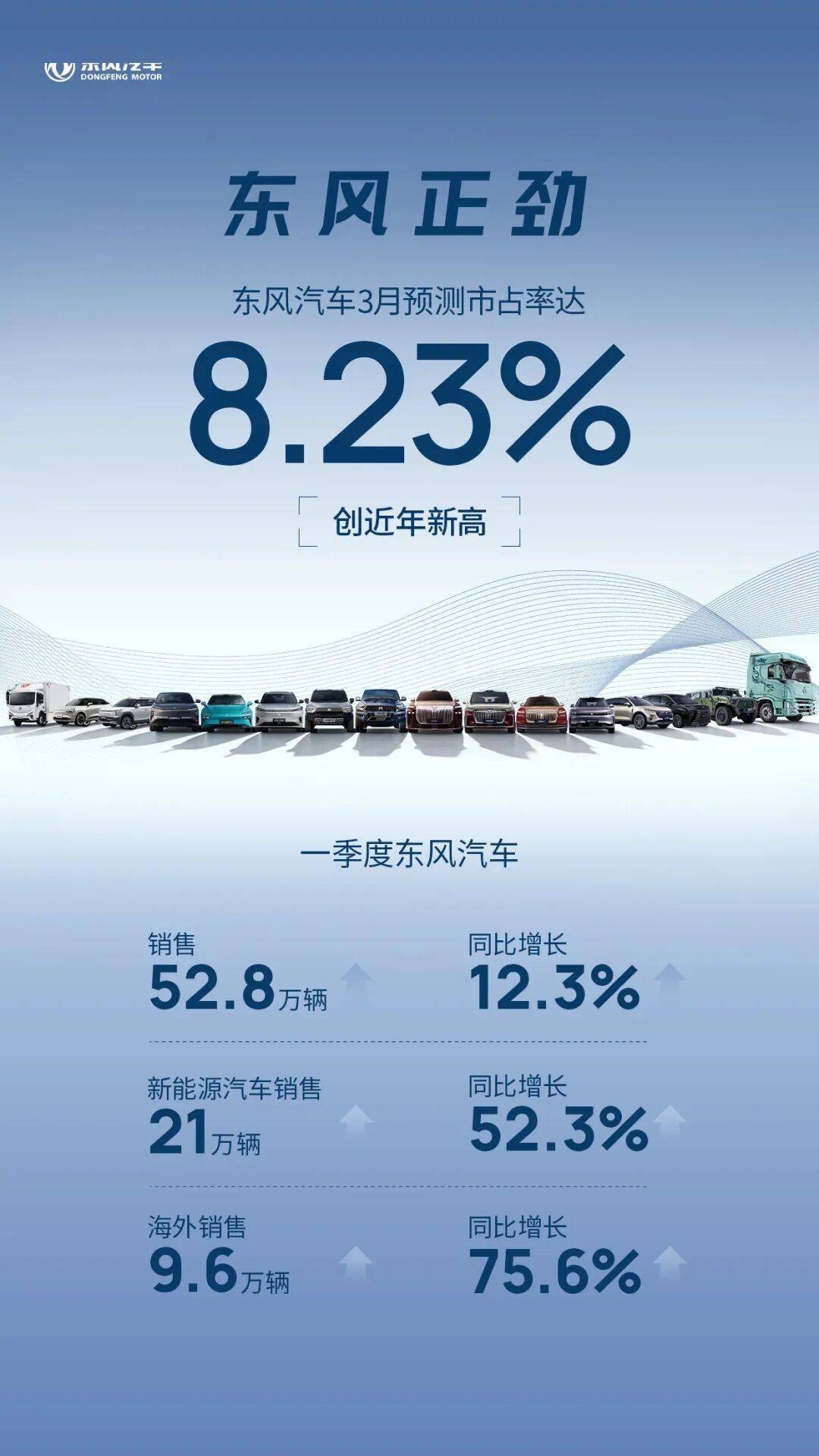 東風(fēng)汽車近日公布了其最新銷售數(shù)據(jù),展現(xiàn)出一系列亮眼的市場表現(xiàn)。今年第一季度,東風(fēng)汽車?yán)塾嬩N量達(dá)到52.8萬輛,較去年同期增長12.3%,其中新能源汽車銷量尤為突出,達(dá)到21萬輛,同比增幅高達(dá)52.3%。海外市場的拓展也取得顯著成效,一季度海外銷量達(dá)到9.6萬輛,同比增長75.6%,顯示出強勁的增長勢頭。