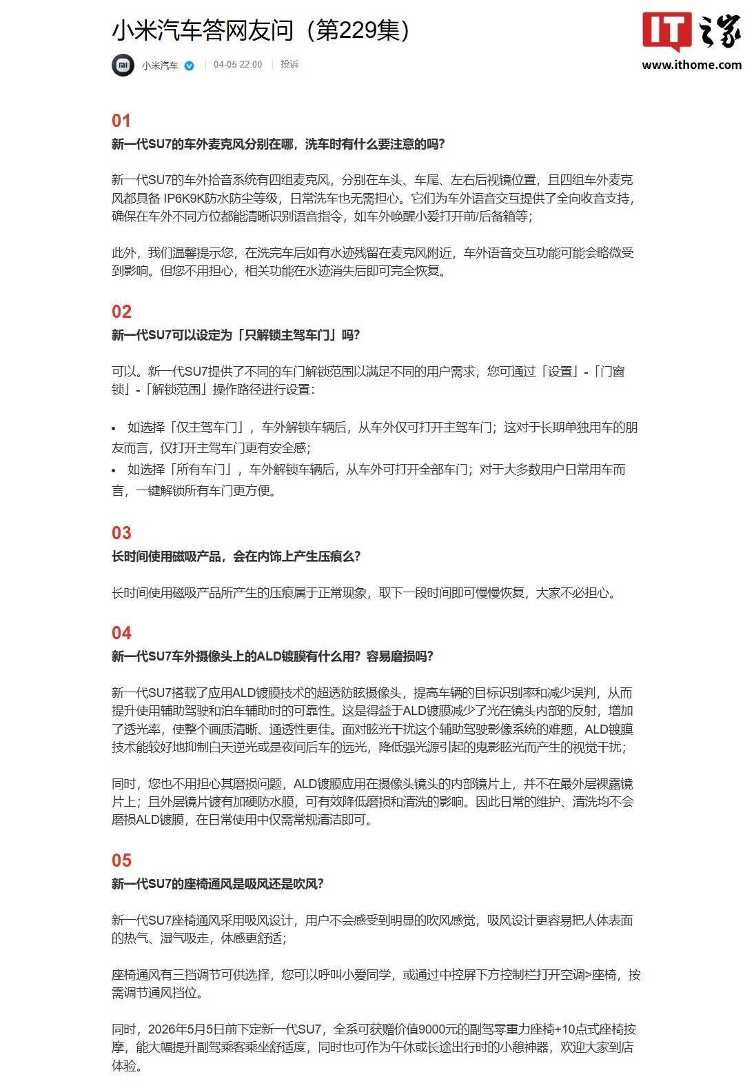 小米汽車近日通過最新一期“答網友問”欄目,針對新一代SU7車型的用戶高頻疑問進行集中解答,涵蓋車外麥克風布局、車門解鎖邏輯、攝像頭鍍膜技術等細節,為消費者提供更全面的產品信息。