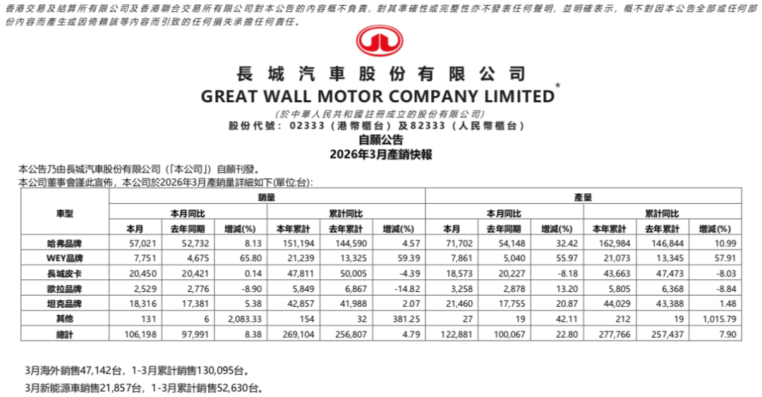 長城汽車近日公布了2026年第一季度的產(chǎn)銷數(shù)據(jù),整體表現(xiàn)穩(wěn)健增長。數(shù)據(jù)顯示,今年1至3月,長城汽車?yán)塾嬩N量達(dá)269104輛,同比增長4.79%。其中,新能源車型銷量為52630輛,海外市場銷量為130095輛,成為推動增長的重要力量。