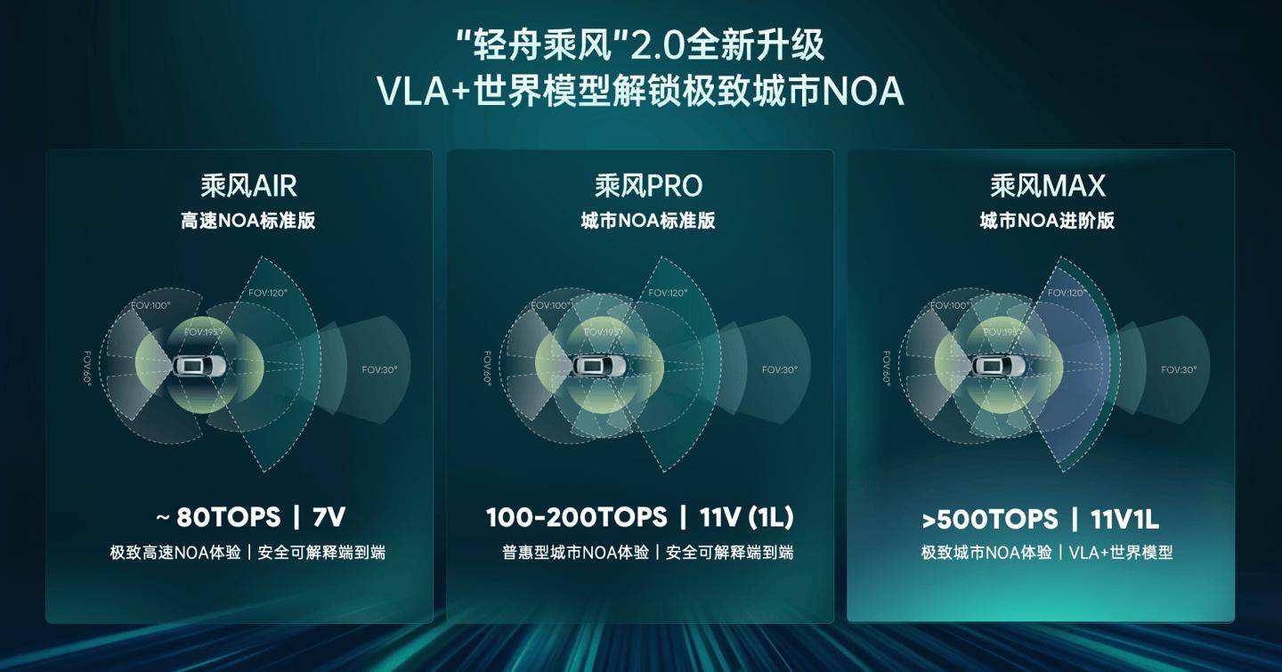 在技術方案方面,輕舟智航的“輕舟乘風2.0”三級產品矩陣已全面落地。其中,乘風AIR方案采用約80TOPS算力、7V傳感器配置,主要提供高速NOA功能;乘風PRO方案則升級至100至200TOPS算力、11V或11V1L配置,支持城市NOA功能;而乘風MAX方案則配備超過500TOPS算力、11V1L配置,深度融合VLA與世界模型,可提供高階城市NOA功能。這些方案為不同場景下的智能駕駛需求提供了多樣化的選擇。