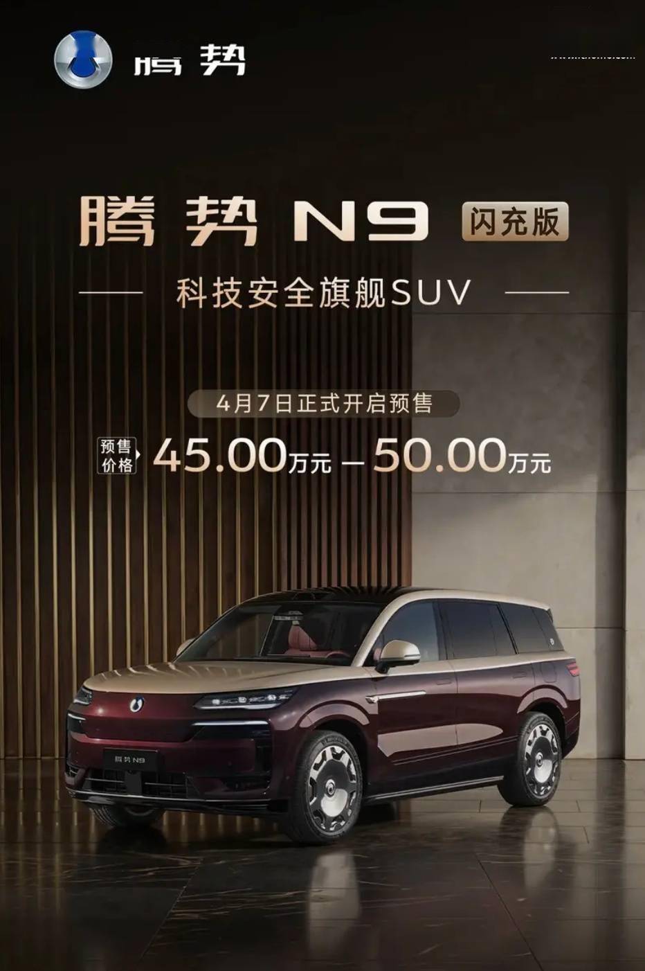 比亞迪旗下高端品牌騰勢近日宣布,其全新N9閃充版正式開啟預售,預售價區間為45萬元至50萬元。這款中大型SUV以第二代刀片電池為核心賣點,CLTC工況下純電續航里程達420公里,并配備行業領先的閃充技術,宣稱可實現"5分鐘快速補能、9分鐘完全充滿"的高效充電體驗。