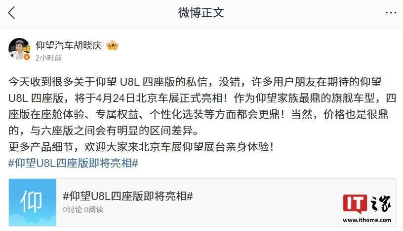 比亞迪仰望銷售事業部總經理胡曉慶近日透露,仰望U8L四座版將于4月24日北京車展正式登場。作為仰望品牌高端旗艦車型,四座版在座艙設計、專屬服務及個性化定制方面進行了全面升級,定位較現有六座版更為高端,價格區間也將形成明顯差異。