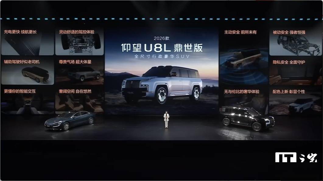 今年3月5日,比亞迪在二代刀片電池暨閃充技術發布會上已提前揭曉2026款仰望家族陣容,涵蓋U7、U8及U8L鼎世版三款車型。其中U8L系列通過搭載第二代刀片電池與閃充技術,實現續航能力顯著提升,同時引入三大安全創新:應急浮水功能可自動激活、NOA系統支持爆胎后穩行穩停、全場景隱私安全防護。老款車型用戶后續可通過OTA升級獲得這些功能。