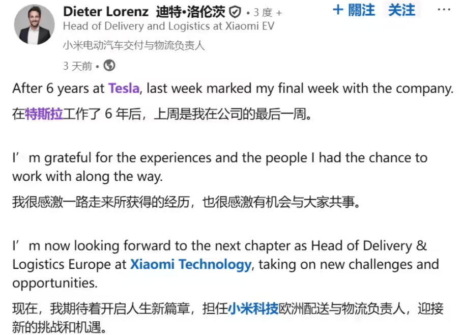 小米汽車(chē)在全球化布局上邁出關(guān)鍵一步,近日正式任命特斯拉前中歐地區(qū)交付運(yùn)營(yíng)高級(jí)經(jīng)理迪特·洛倫茨(Dieter Lorenz)擔(dān)任歐洲交付與物流負(fù)責(zé)人。根據(jù)洛倫茨在社交平臺(tái)發(fā)布的聲明,其已于本月初結(jié)束在特斯拉長(zhǎng)達(dá)六年的職業(yè)生涯,轉(zhuǎn)投小米科技。公開(kāi)資料顯示,洛倫茨在特斯拉期間曾擔(dān)任中歐運(yùn)營(yíng)經(jīng)理、德國(guó)運(yùn)營(yíng)經(jīng)理等核心崗位,積累了豐富的區(qū)域市場(chǎng)運(yùn)營(yíng)經(jīng)驗(yàn)。
