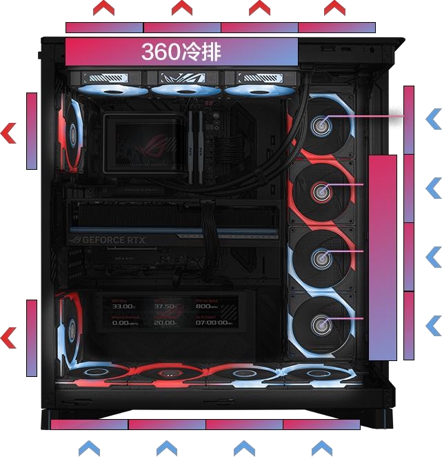 對于一套穩定運行的主機來說,良好的散熱與擴展支持至關重要。ROG幻世神海景房機箱在這方面表現出色,其支持14顆120mm風扇,并兼容2×360mm冷排,無論是風冷還是水冷方案,都能輕松適配,為玩家提供了豐富的散熱選擇。該機箱還支持180mm風冷散熱器高度,底部風扇進風表現出色,即使在主機高負載運行時,也能保持穩定。搭配可旋轉式風扇支架,進一步提升了進出風效率,優化了機箱內部的空氣流通。在擴展方面,該機箱提供了充足的擴展空間,兼容最新BTF主板,還配備了雙20Gbps Type-C接口與PD快充功能,充分滿足了玩家未來升級顯卡或其他硬件的需求,無需擔心兼容性問題,為主機的未來發展預留了充足的空間。