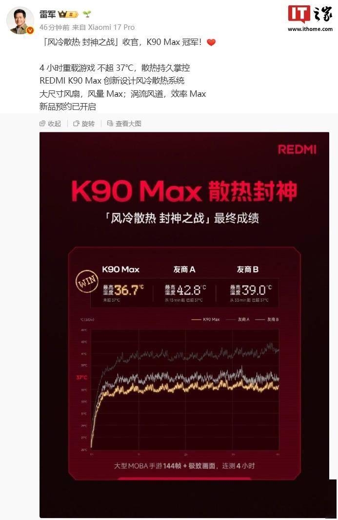 在眾多參賽機(jī)型中,REDMI K90 Max憑借出色的表現(xiàn)脫穎而出。小米創(chuàng)始人雷軍在直播中宣布,這款手機(jī)在MOBA游戲4小時(shí)重載實(shí)測(cè)(144幀+極致畫(huà)質(zhì))中,機(jī)身最高溫度僅為36.7℃,展現(xiàn)了卓越的散熱性能。這一成績(jī)不僅證明了其風(fēng)冷散熱系統(tǒng)的有效性,也為用戶(hù)在高強(qiáng)度游戲場(chǎng)景下提供了更加穩(wěn)定的使用體驗(yàn)。
