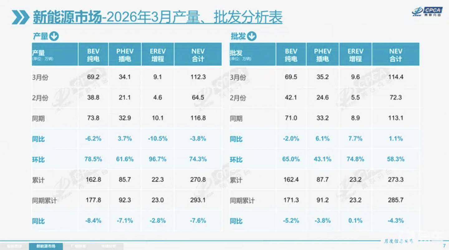 豪華車市場呈現(xiàn)企穩(wěn)跡象,3月零售21萬輛環(huán)比增長62%,市場份額提升至12.9%。隨著產(chǎn)品定價策略調整,傳統(tǒng)豪華品牌展現(xiàn)出較強韌性。新能源乘用車領域則呈現(xiàn)"冰火兩重天":生產(chǎn)端112.3萬輛的產(chǎn)量同比下降3.8%,但批發(fā)銷量達114.4萬輛實現(xiàn)1.1%的同比增長。零售市場84.8萬輛的銷量雖同比下降14.4%,但環(huán)比激增82.6%,顯示出需求端的強勁復蘇勢頭。