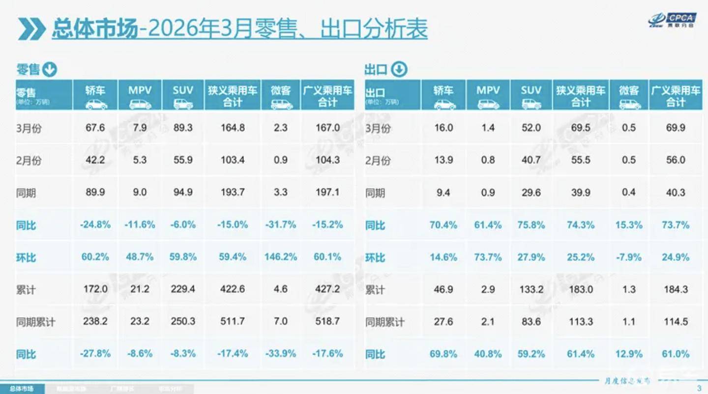 根據(jù)乘聯(lián)會最新發(fā)布的數(shù)據(jù),2026年3月全國乘用車市場呈現(xiàn)出復雜態(tài)勢。當月全國乘用車零售總量達164.8萬輛,盡管環(huán)比出現(xiàn)59.4%的顯著增長,但同比仍下降15.0%。今年前三個月累計零售量422.6萬輛,同比降幅達17.4%,反映出市場整體承壓態(tài)勢。
