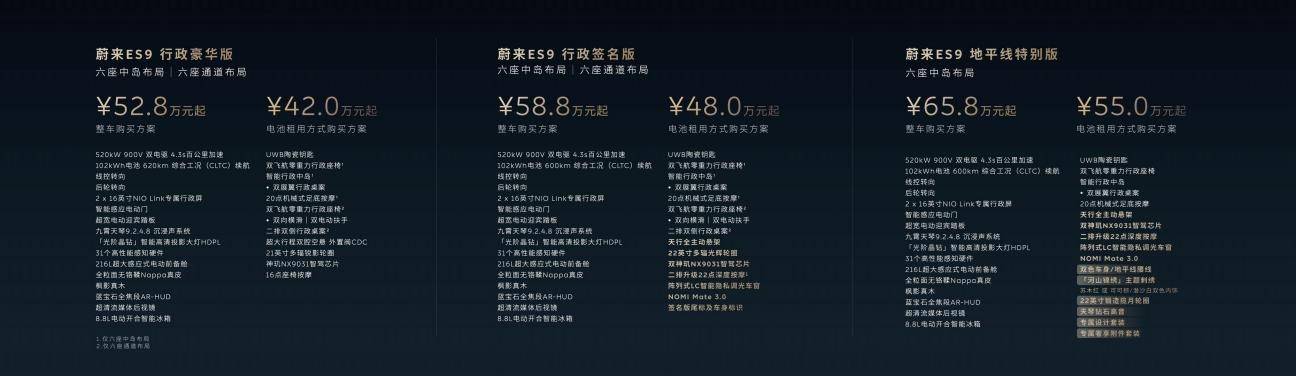 預售方案提供行政豪華版、行政簽名版、地平線特別版三個版本,起售價分別為52.8萬元、58.8萬元和65.8萬元。選擇BaaS電池租用方案的用戶可享受10.8萬元至10.8萬元不等的價格優惠,最低預售價下探至42萬元。即日起至正式上市前,預訂用戶支付5000元定金可抵扣1萬元購車款,蔚來ES8創始版首任車主額外獲得1萬元煥新禮金券,非創始版ES8車主及樂道、螢火蟲品牌首任車主分別可享6000元禮金券和2萬復購積分。