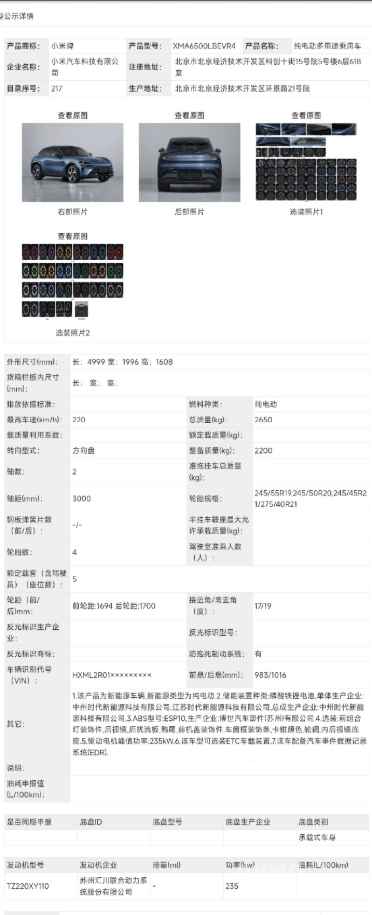 小米YU7新車型亮相工信部目錄 后驅單電機配寧德時代電池 輪轂樣式再升級