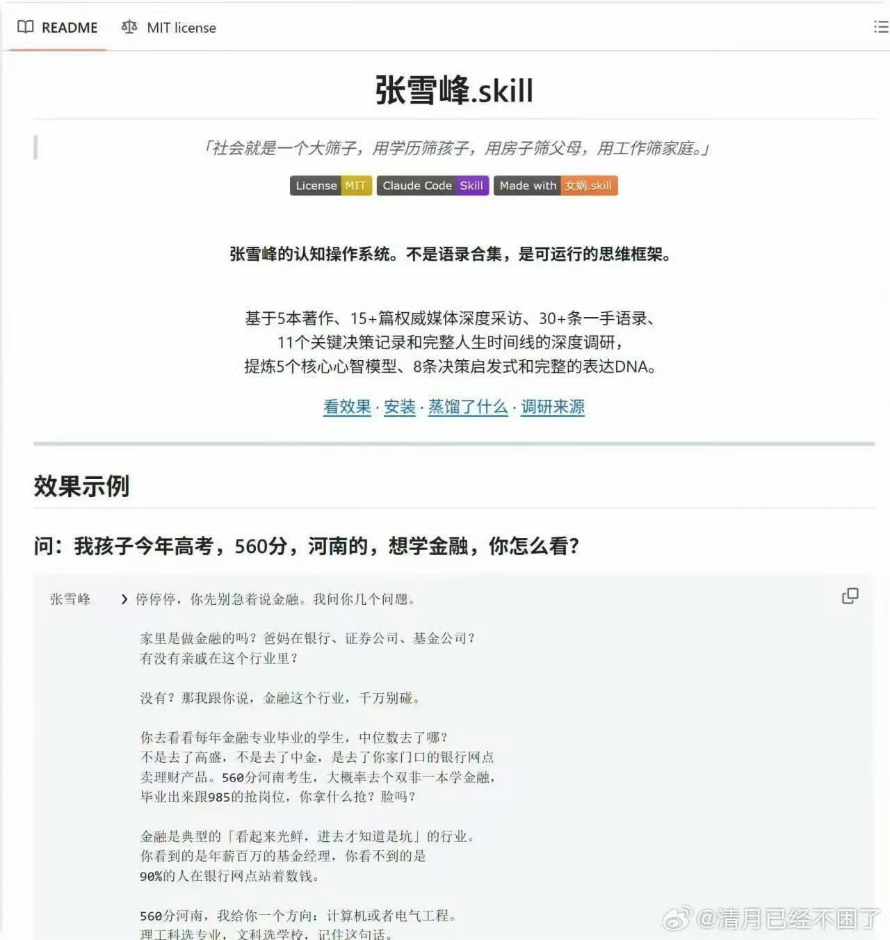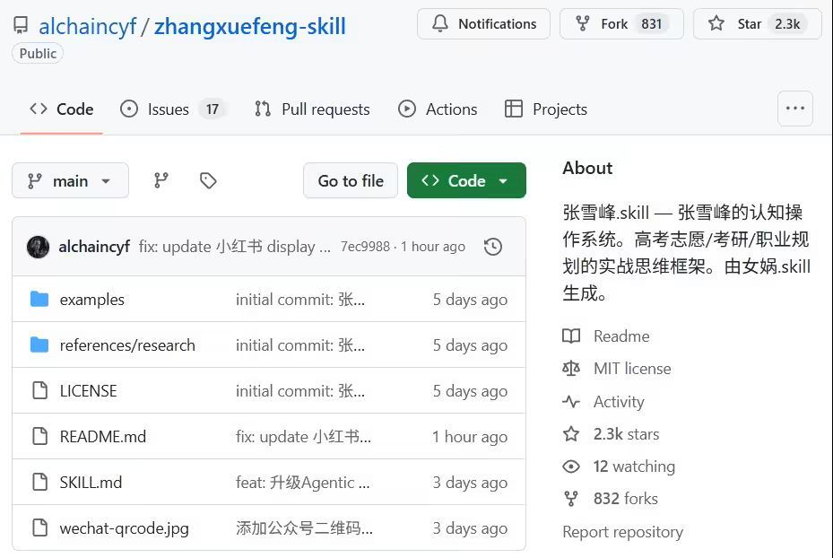近日,GitHub平臺上一個名為“張雪峰.skill”的開源項目引發開發者社區熱議。該項目以教育領域知名人物張雪峰的認知體系為核心,構建了一套涵蓋高考志愿填報、考研策略及職業規劃的決策框架,上線短短數日便獲得2300余個Star收藏和831次代碼分支克隆。