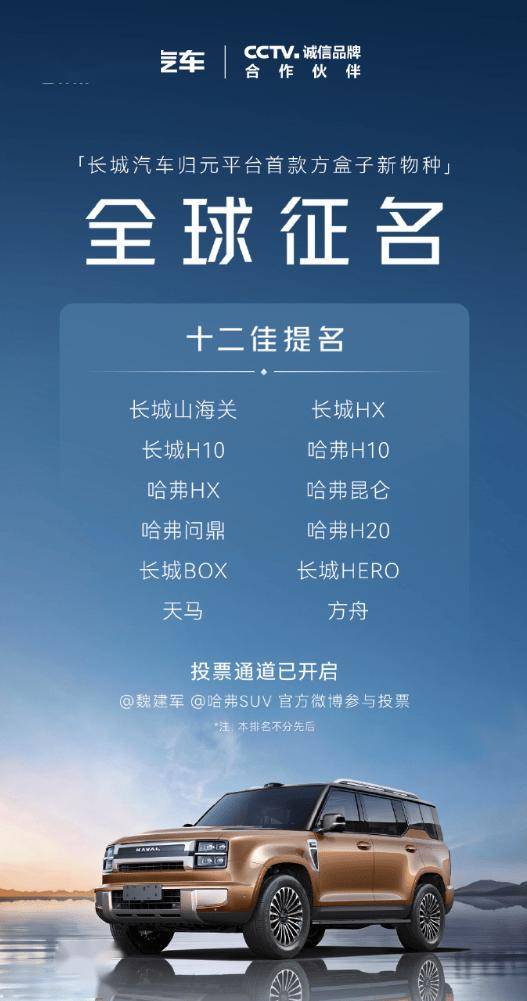 長城哈弗近日為歸元平臺首款方盒子車型發起全球征名活動,十二個候選名稱現已揭曉,投票通道將持續開放至4月13日12:00。此次入圍的命名方案涵蓋地理標志、文化符號與科技概念,包括“長城山海關”“哈弗昆侖”“天馬”“方舟”等,部分名稱如“長城HX”“哈弗H10”出現重復提交情況。