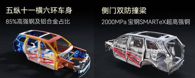 被動安全方面,華境S同樣表現出色。高強度鋼和鋁合金占比達85.05%,其中熱成型超高強鋼占比29.97%。乘員艙部分搭載全球首創的1500MPa一體式熱成型地板骨架與1500MPa一體式熱成型門環兩大專利技術,同時配備1500mm超長鋁合金防撞梁和2000MPa四門八處防撞梁,正向和側向安全防護全面。