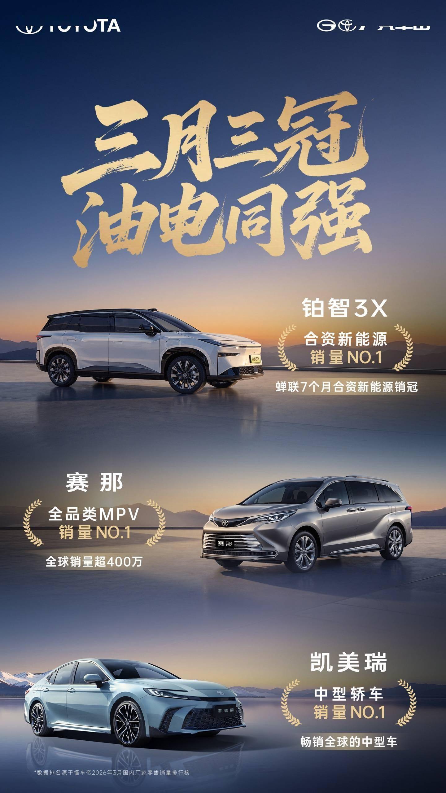 從新能源車型到傳統燃油車,從家用轎車到高端MPV,廣汽豐田以全面的產品布局和強大的產品實力,實現了油電雙線的領跑。此次“三月三冠”的佳績,不僅體現了市場和消費者對廣汽豐田的高度認可,也彰顯了品牌在市場深耕和技術創新方面的硬核實力。