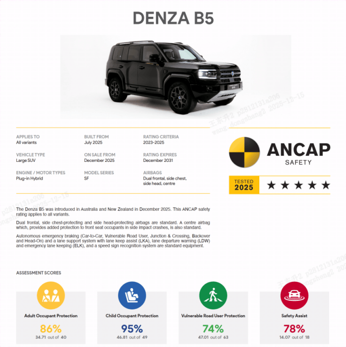 業內專家指出,方程豹豹5的安全設計體現了比亞迪對新能源越野車型的深度理解。其高強度車身結構與智能安全系統的協同作用,既滿足了越野場景的極端需求,又兼顧了日常使用的安全性。此次ANCAP五星認證不僅強化了該車型在海外市場的競爭力,更為消費者提供了更可靠的安全保障,印證了“安全即豪華”的產品理念。