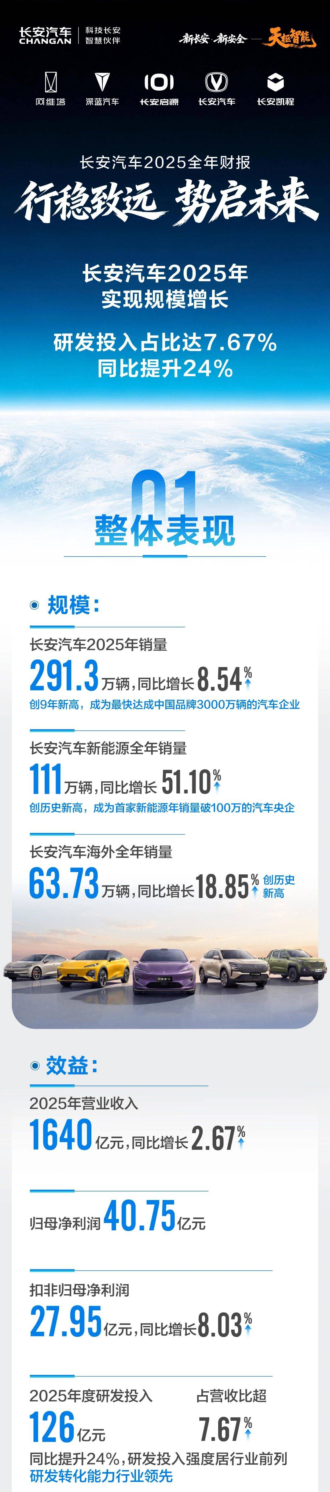 在電動化與智能化浪潮的深度洗禮下,中國汽車產業正經歷著前所未有的變革。長安汽車憑借前瞻性戰略布局與持續創新,在2025年交出了一份令人矚目的成績單:全年銷量突破291.3萬輛,同比增長8.5%,創下近九年新高;營業收入達1640億元,同比增長2.7%,實現銷量與營收雙突破。這一成績的取得,不僅彰顯了企業應對行業周期性挑戰的韌性,更標志著其向智能低碳出行科技公司轉型邁出關鍵一步。