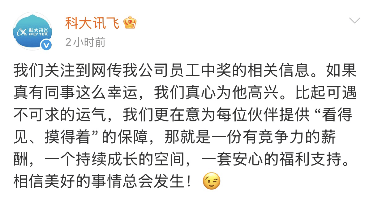隨著事件持續發酵,各種細節被不斷添油加醋:中獎彩票類型從大樂透變成雙色球,中獎者身份從正式員工演變為外包人員,甚至有傳言稱公司HR因員工“說走就走”氣得咬牙切齒。面對愈演愈烈的猜測,科大訊飛官方微博于次日發布聲明,既未承認也未否認中獎事實,僅表示“若真有同事如此幸運,我們真心為他高興”,同時強調公司更注重為員工提供“有競爭力的薪酬、成長空間和福利保障”。這份回應被網友評價為“高情商招聘廣告”,巧妙轉移了輿論焦點。