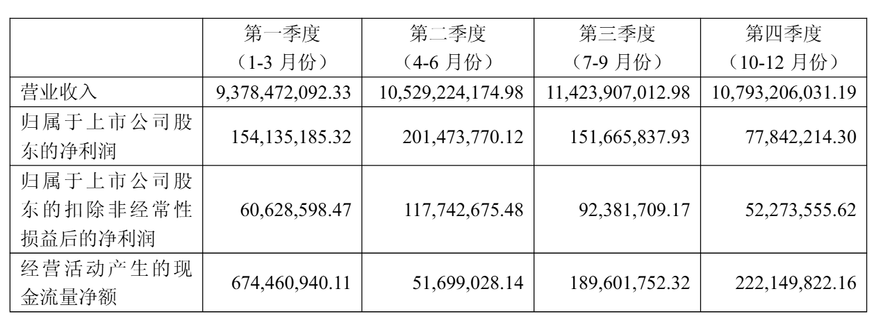 分季度來看,第四季度表現(xiàn)成為全年業(yè)績的關(guān)鍵節(jié)點。該季度公司營收107.93億元,凈利潤7784萬元,扣非后凈利潤5227萬元。盡管單季營收規(guī)模保持穩(wěn)定,但利潤端承壓明顯,尤其是扣非凈利潤環(huán)比下滑,顯示出成本控制與運營效率面臨挑戰(zhàn)。