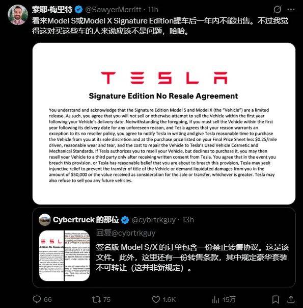 購車協議中設置的"霸王條款"引發熱議。根據條款規定,車主在交付后一年內若擅自轉賣車輛,將面臨雙重處罰機制:需支付5萬美元(約合36萬元人民幣)違約金,或賠償轉賣所得的全部利潤,兩者取其高者執行。更嚴厲的是,違規者將被列入特斯拉黑名單,永久失去購買新車的資格。