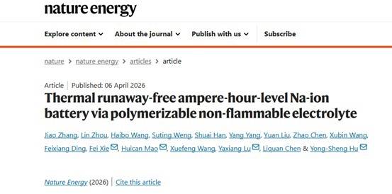 中國(guó)科學(xué)院物理研究所胡勇勝研究員團(tuán)隊(duì)近日取得突破性進(jìn)展,在全球范圍內(nèi)首次實(shí)現(xiàn)安時(shí)級(jí)鈉離子電池的“無(wú)熱失控”技術(shù)。該團(tuán)隊(duì)研發(fā)的新型可聚合不燃電解質(zhì)(PNE),通過(guò)主動(dòng)阻斷熱失控路徑,從材料層面破解了電池安全的核心難題。相關(guān)研究成果已發(fā)表于國(guó)際頂級(jí)能源期刊《自然?能源》,為鈉離子電池的商業(yè)化應(yīng)用按下“加速鍵”。